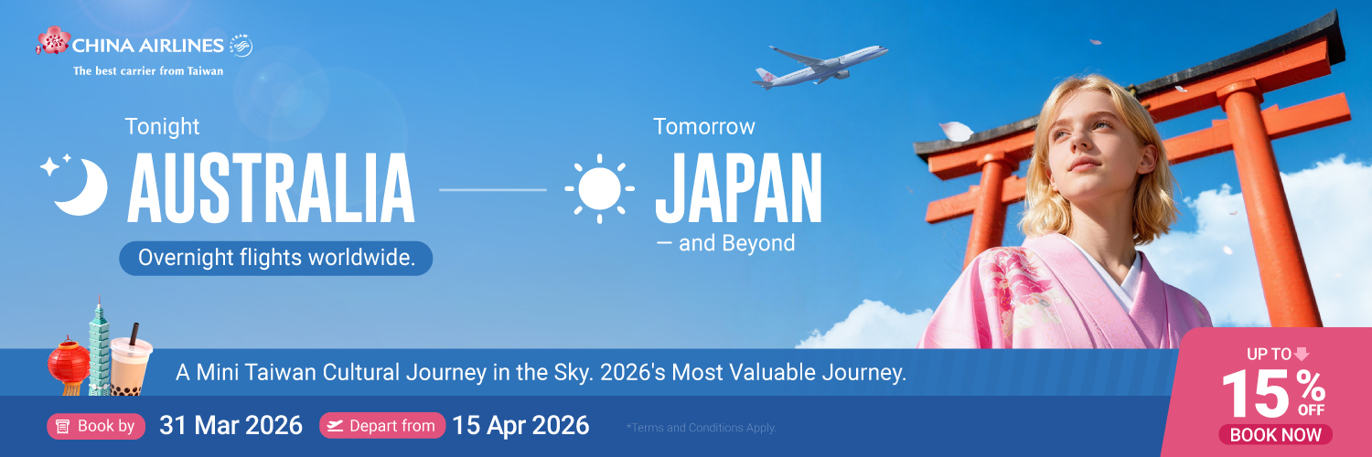 As temperatures drop in Australia, escape the winter chill and chase the sun with China Airlines. From London’s golden sunsets to Japan’s vibrant summer festivals , maximize your adventure with our overnight flights and morning arrivals—allowing you to save a night and gain a full day of exploration. We also include a 2-piece baggage allowance, providing plenty of room for all your summer shopping and souvenirs. Book your northern summer escape today and turn your travel dreams into reality.